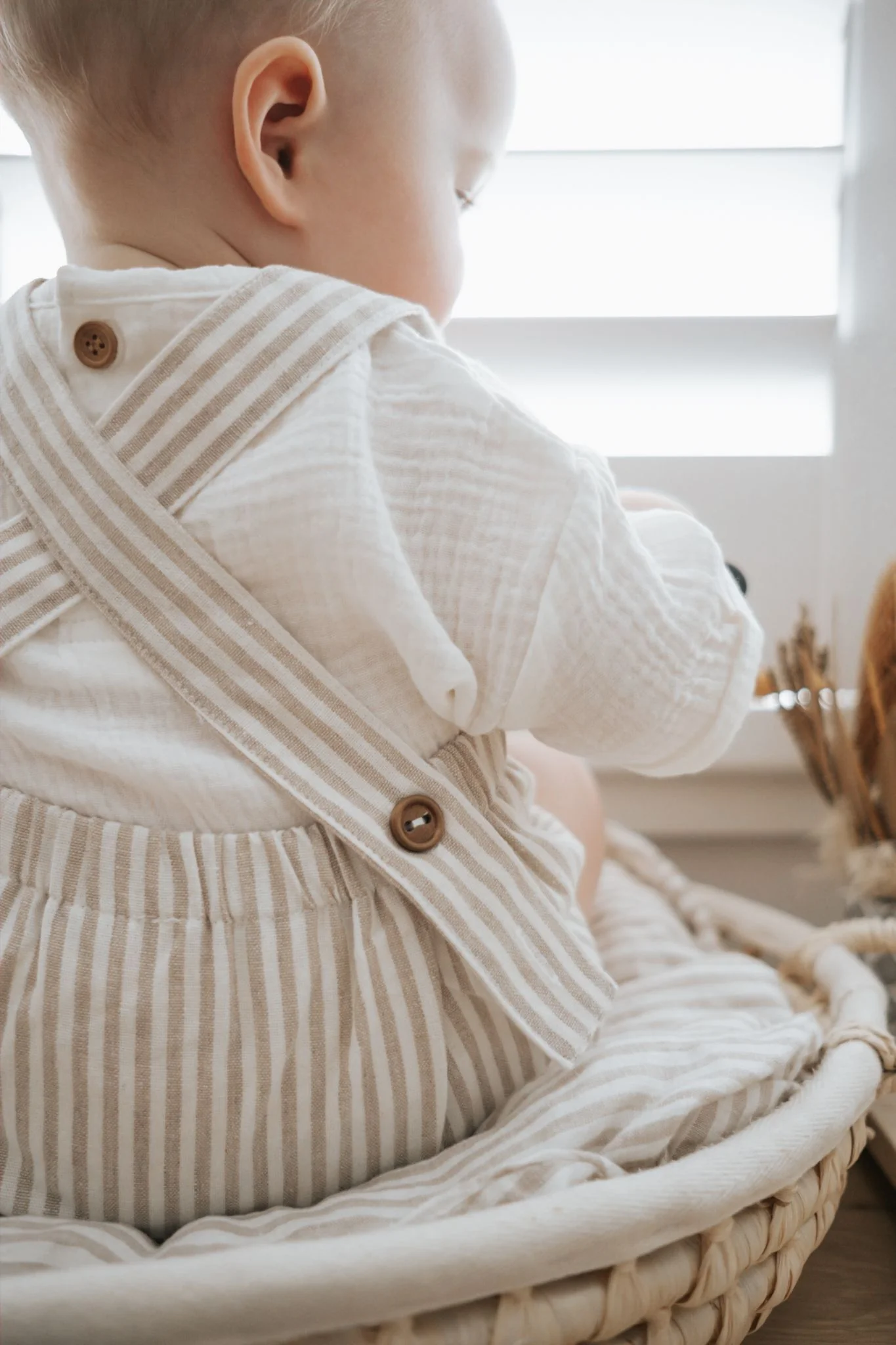 Our Cross Back Romper is the perfect summer piece for your little love. With an adorable neutral stripe print, and adjustable straps with wooden buttons, it is lightweight and breathable ensuring maximum comfort. A must-have wardrobe staple this season!
