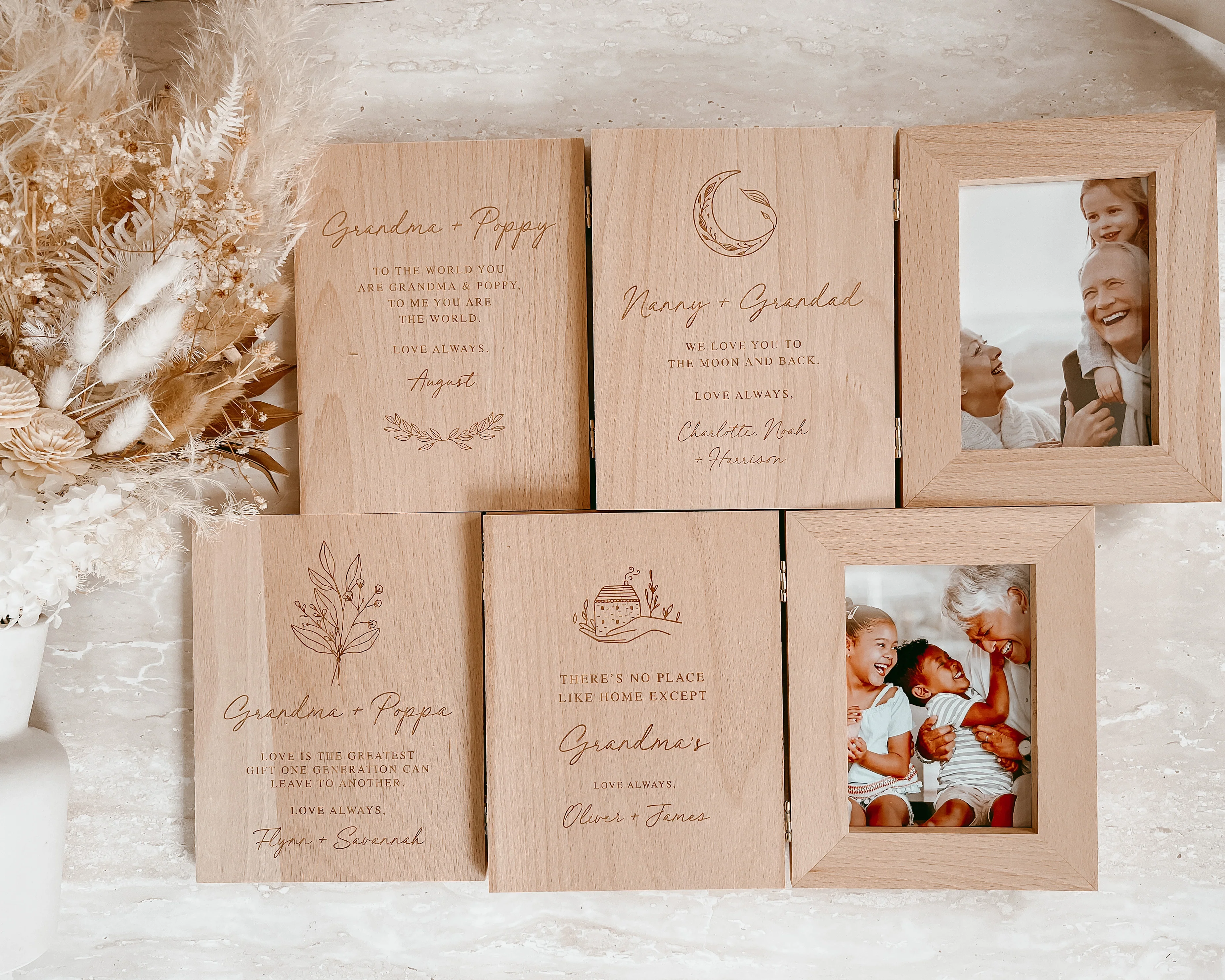 Our beautiful book style Wooden Photo Frames are the perfect personalised gift or keepsake for your loved ones. Made from beech wood with gold hinges, each frame fits a portrait 5x7 inch photo. Lovingly engraved on the left side in our timeless script and serif fonts, it is sure to be treasured for years to come.