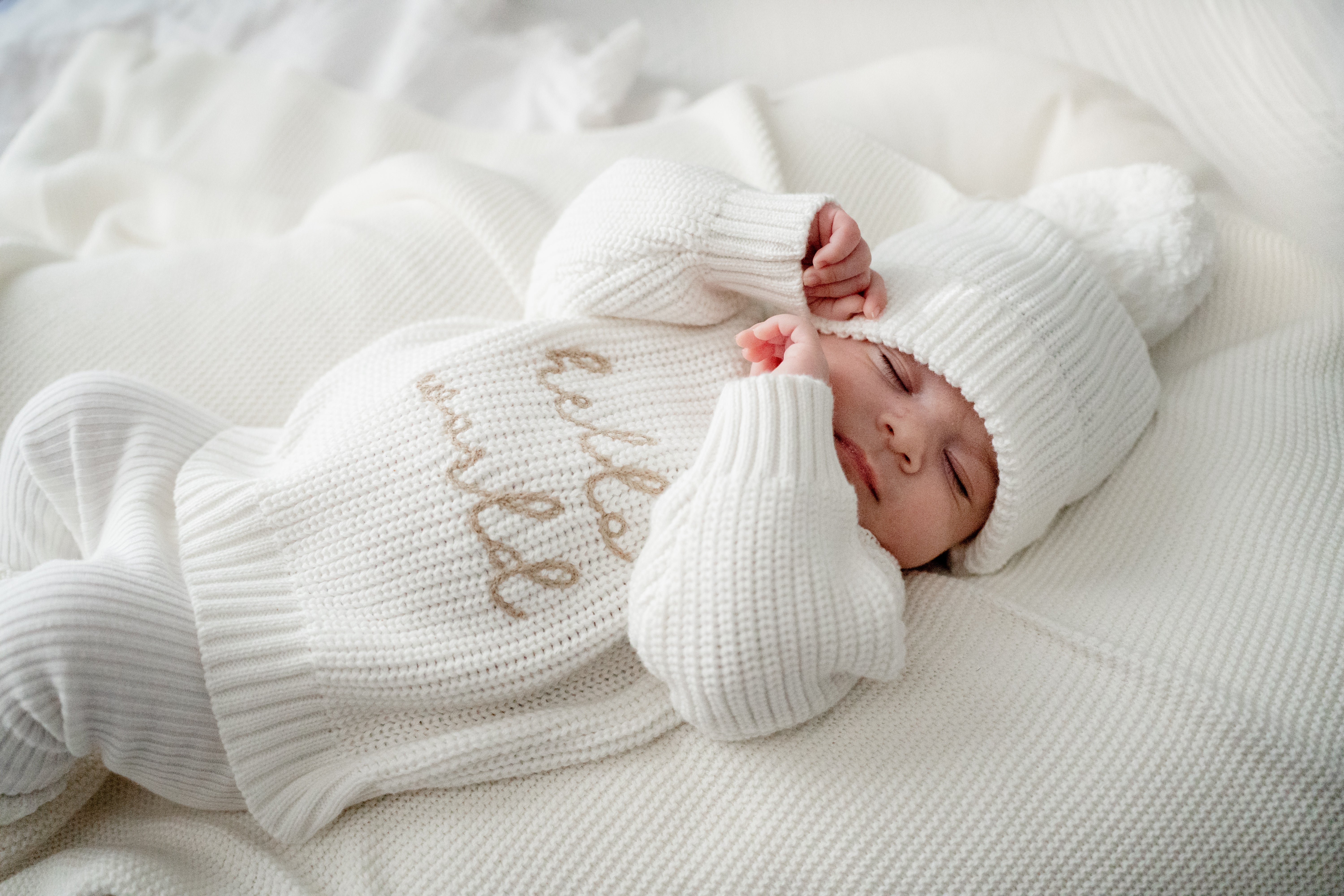 Our beautiful cosy chain knit embroidered 'Hello World' Mini Knit Sweater is the perfect debut piece for your little love.