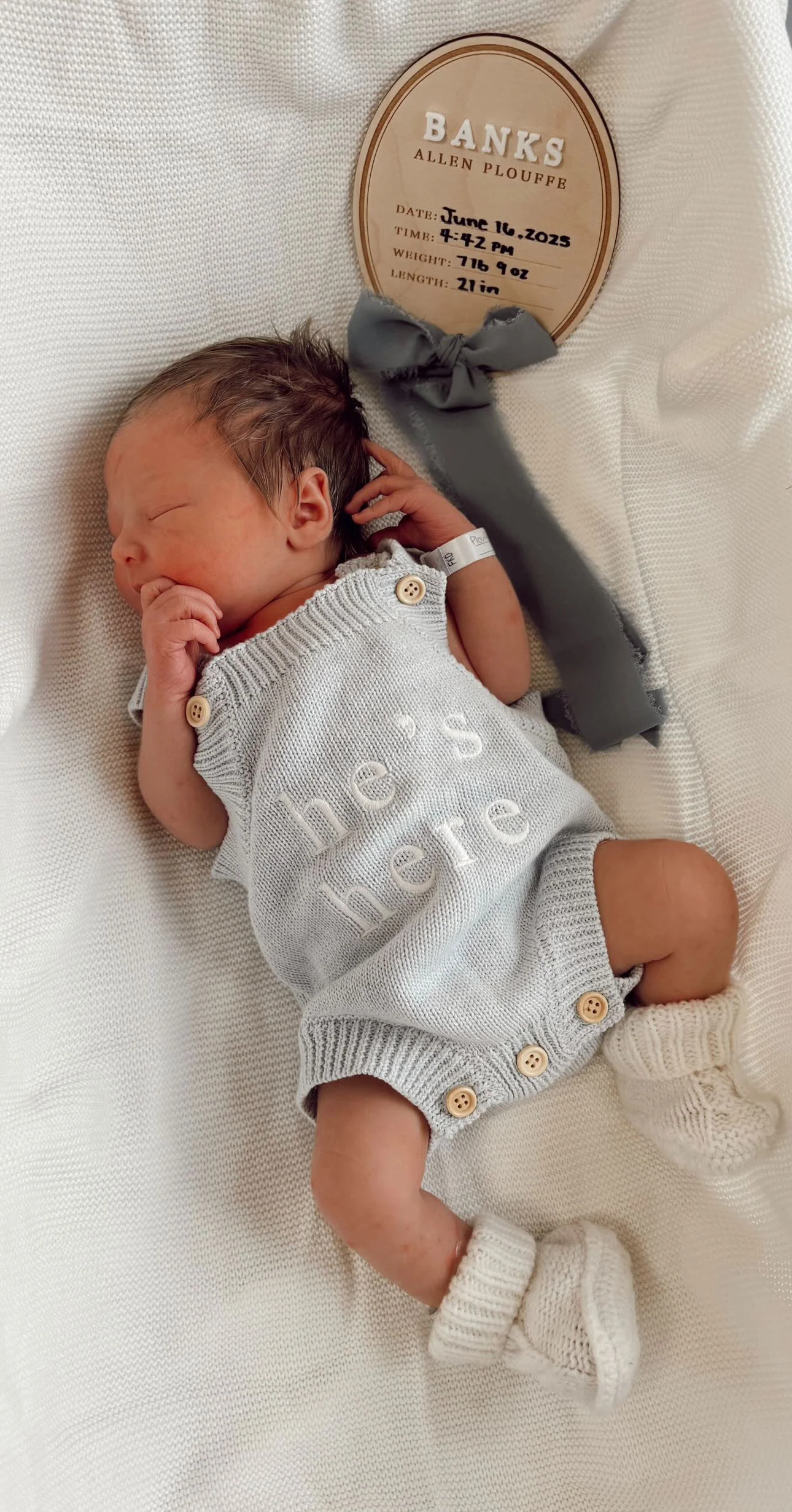 Our beautiful 'He's Here' Singlet Mini Knit Romper is the cutest debut piece for your little love.