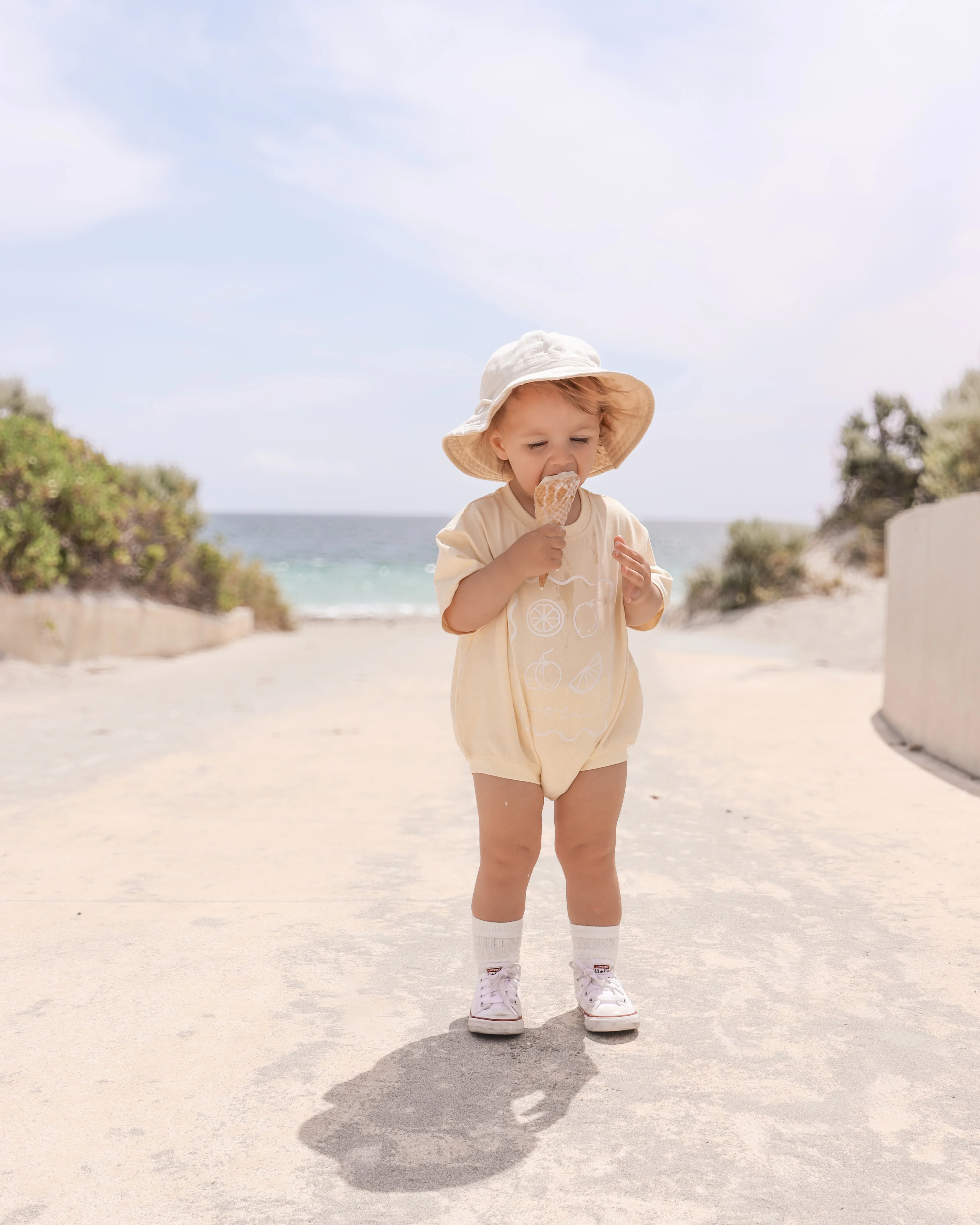 Introducing our Lemon Slouch Romper as part of our Sorbet Summer Collection! This short sleeve romper is a perfect playful summer essential. Made for a comfy, boxy, oversized fit available in sizes NB-2Y.