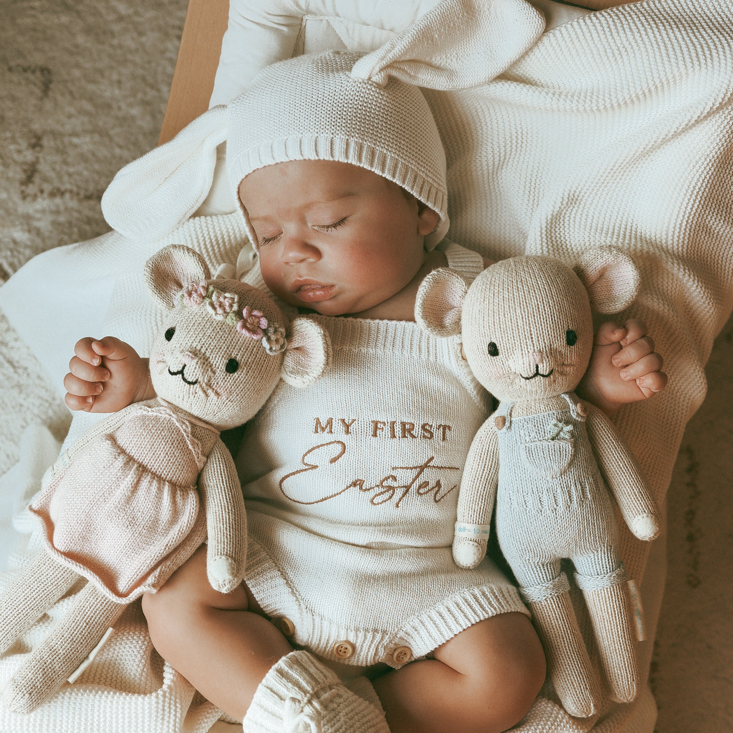 Paired with our soft Bunny Ear Bonnet and matching knit booties, each piece is crafted from luxuriously soft cotton and designed as an heirloom addition to your little one’s capsule wardrobe. Ideal for Easter celebrations, photos, and cherished first memories.