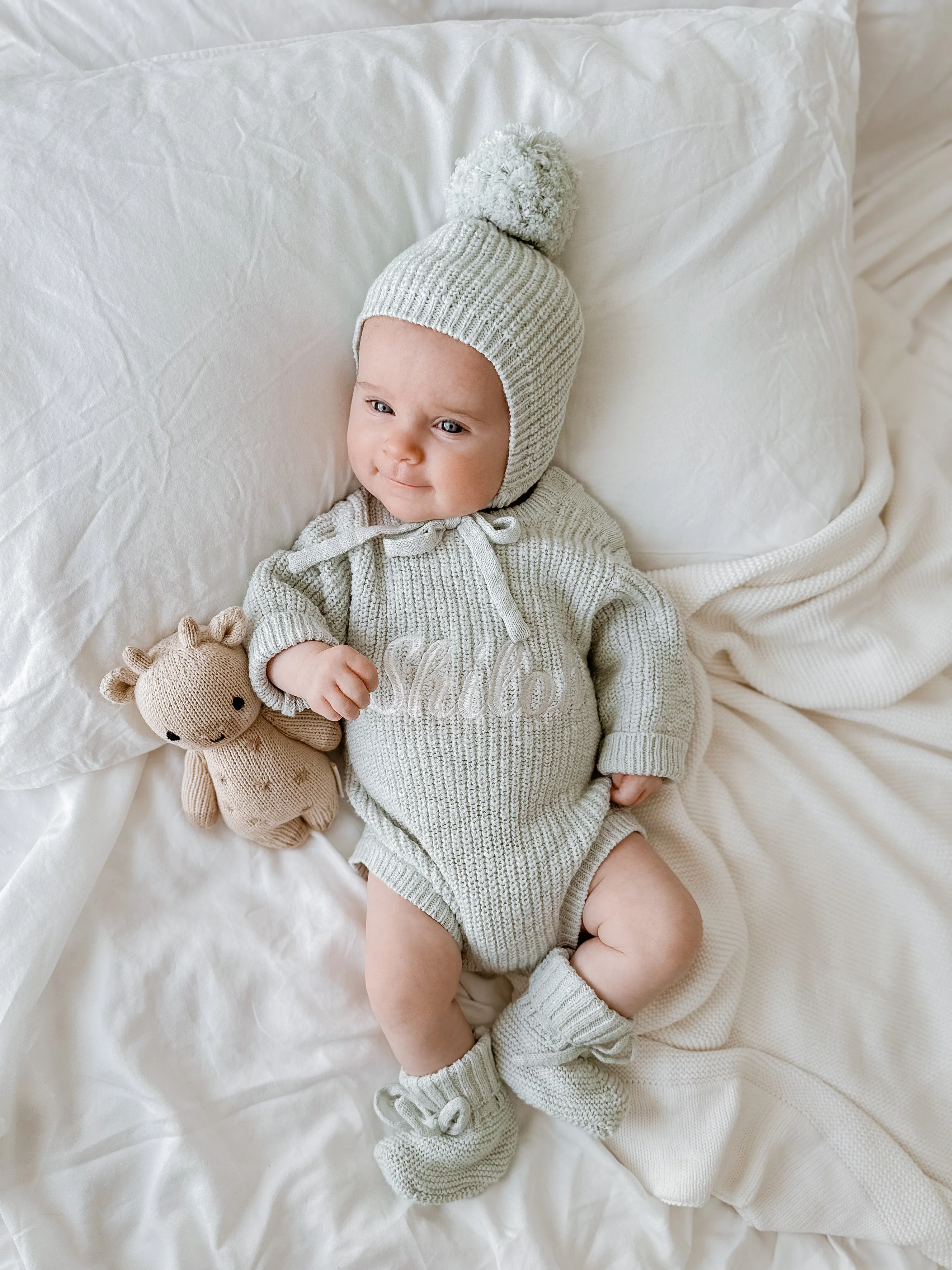 Complete the look with our matching Chunky Knit Romper & Booties.