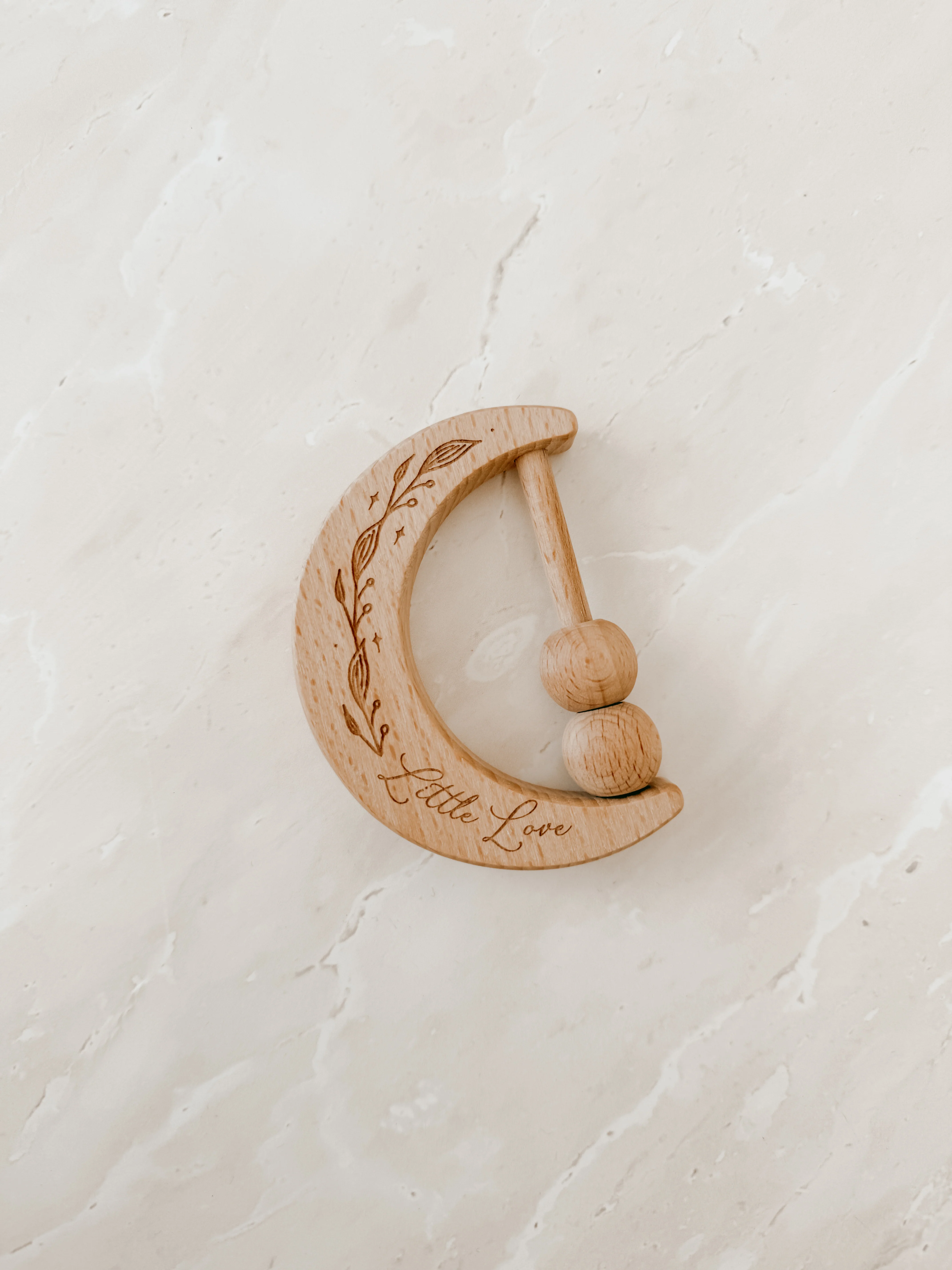 Made from premium beechwood, each rattle is lovingly engraved in our studio.Â